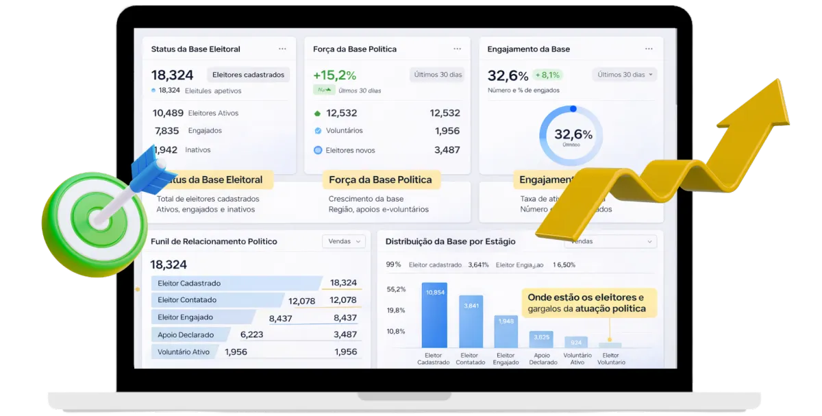 Acompanhe eleitores, lideranças, demandas, campanhas e resultados em um único painel estratégico.